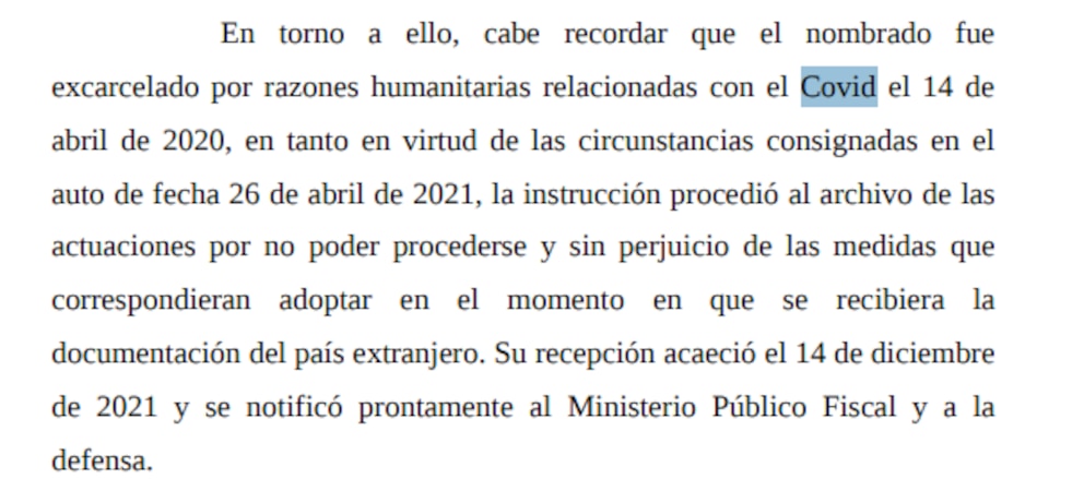 “En torno a ello, cabe recordar que el nombrado fue excarcelado por razones humanitarias relacionadas con el COVID el 14 de abril de 2020″, asegura un fallo de la Sala II de la Cámara Federal al que accedió este medio, firmado en junio de 2022. También, según la misma decisión judicial, el Gobierno de Perú no presentó en el plazo de 60 días los pedidos correspondientes para cerrar el proceso, un plazo establecido por la Ley 26.082.