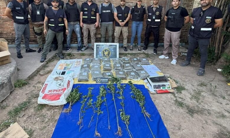 Durante el procedimiento, el personal policial secuestró 19 paquetes termosellados con una sustancia vegetal verde amarronada que, tras el pesaje y las pruebas de campo, arrojó resultado positivo a cogollos de Cannabis Sativa, con un total de 19,030 kilogramos. Además, se hallaron once plantas con características compatibles con marihuana, un teléfono celular marca TCL, dos balanzas de precisión y 68.100 pesos en efectivo.