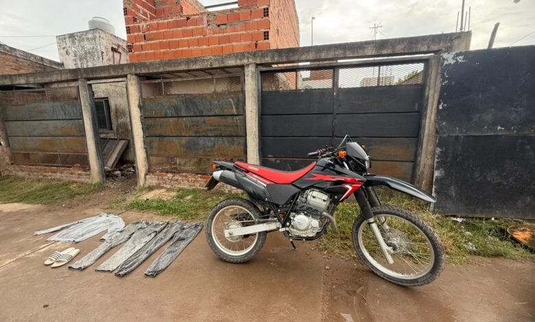 El primer allanamiento se llevó a cabo en una vivienda ubicada sobre la avenida Belgrano al 2900, en Villa Don Alberto. En el lugar detuvieron a una mujer de 29 años y a dos hombres de 48 y 18 años, además de secuestrar una motocicleta marca Honda Tornado de 250 cilindradas y distintas prendas de vestir relacionadas con la causa.