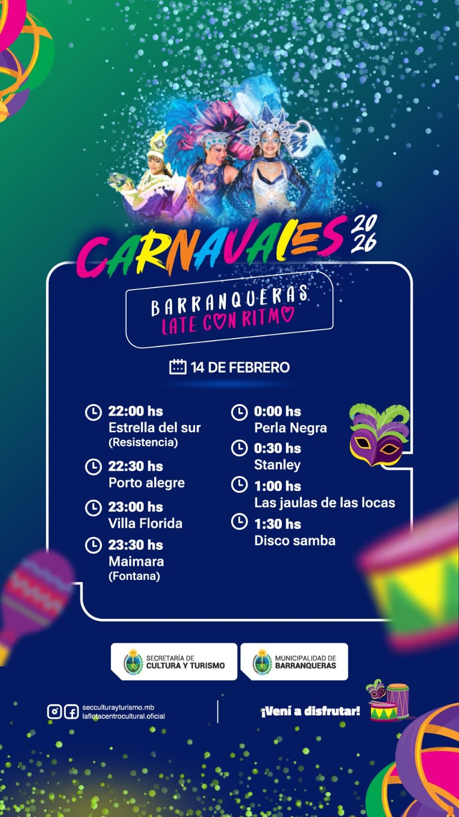 Con gran expectativa y una fuerte impronta popular, la ciudad se prepara para vivir dos noches a puro color, música y baile con los Carnavales Barranqueras 2026, que se realizarán este *sábado 14 y domingo 15 de febrero, con entrada *libre y gratuita*