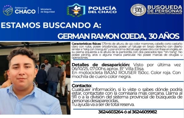 La Policía del Chaco en base a una denuncia registrada en Comisaria Quinta Metropolitana, solicita a la comunidad su valiosa colaboración de informar a la unidad policial más cercana cualquier información relacionada al paradero de Germán Ramón Ojeda, de 30 años, de 1,75 metros de altura, de contextura física robusta, tez blanca, cabello ondulado castaño claro, ojos color marrones Se le ha visto por última vez en el barrio Villa Elisa el pasado lunes 6 de octubre.