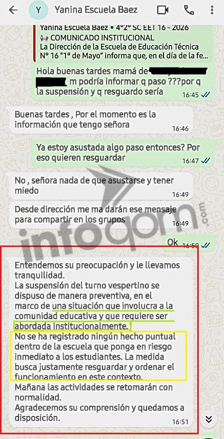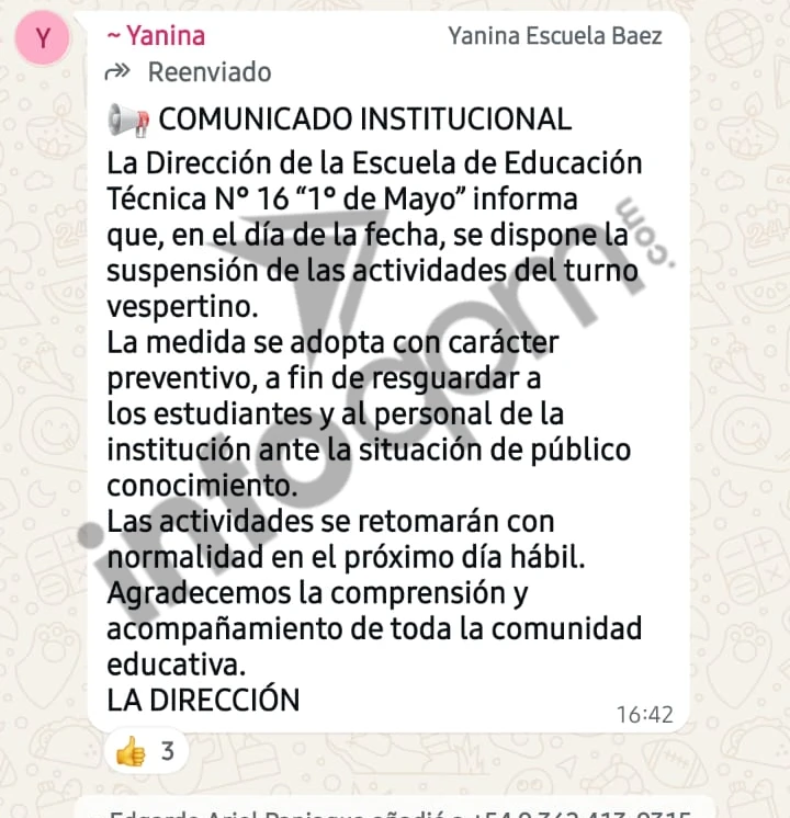 El pasado domingo, luego del fatal desenlace, la Escuela solo distribuyó este simple comunicado donde suspende las clases del turno tarde, al cual asistía Fernanda. Indicando que se trataba de «prevenir» y resguardar a los estudiantes, como así también a los docentes.