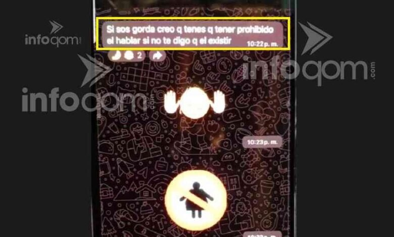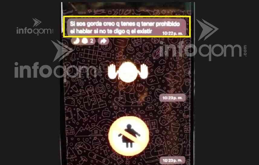 Una fuente confiable, facilitó a INFOQOM la captura de pantalla, en donde un compañero o compañera, habría enviado un mensaje inhumano: «Si sos gorda creo q tenes q tener prohibido el hablar si no te digo q el existir» (sic).