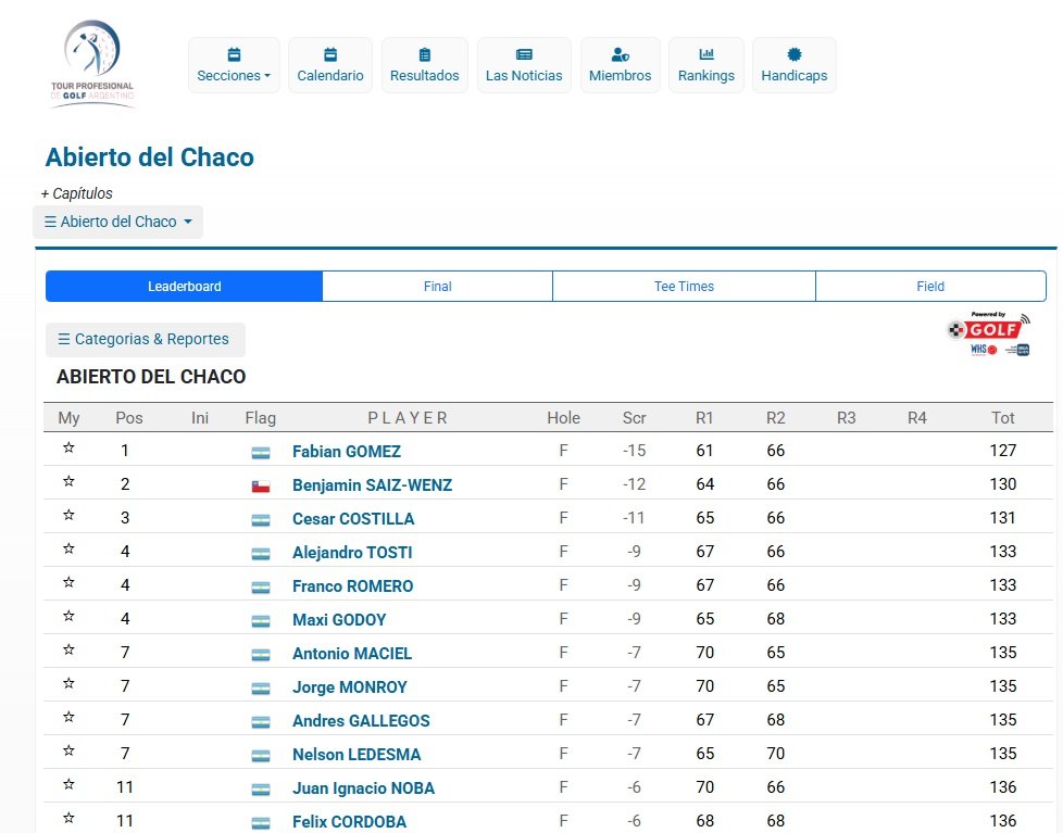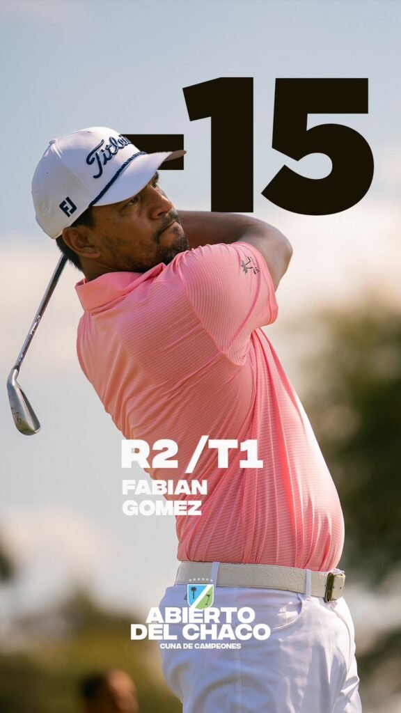Fabián Gómez continúa liderando cumplidas las dos primeras vueltas del primer Abierto del Chaco Cuna de Campeones. Con registros de 61 y 66 golpes para ambos días, el local suma 127, quince bajo el par, tomando distancia de tres sobre el chileno Benjamín Saiz-Wenz que lo escolta, siendo a su vez perseguido por César Costilla con un golpe más que él. El recorrido de Gómez incluyó birdies al 7, 11, 15, 16, 18 y bogey en el 4.