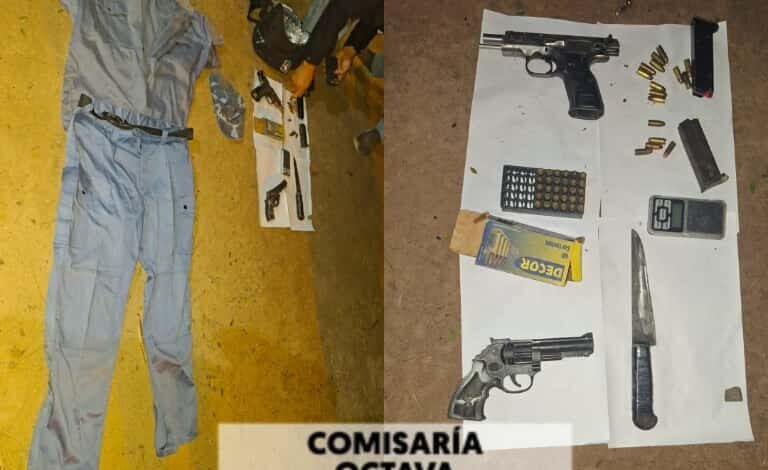 En su poder tenían una pistola 9mm Tanfoglio, dos almacenes cargadores, 46 cartuchos calibre 9 mm, un revolver de juguete, pantalón, camisa y gorra de uniforme policial, un cuchillo y una balanza digital. No supieron dar explicaciones sobre lo hallado. Procedieron al secuestro y al traslado a la dependencia policial.