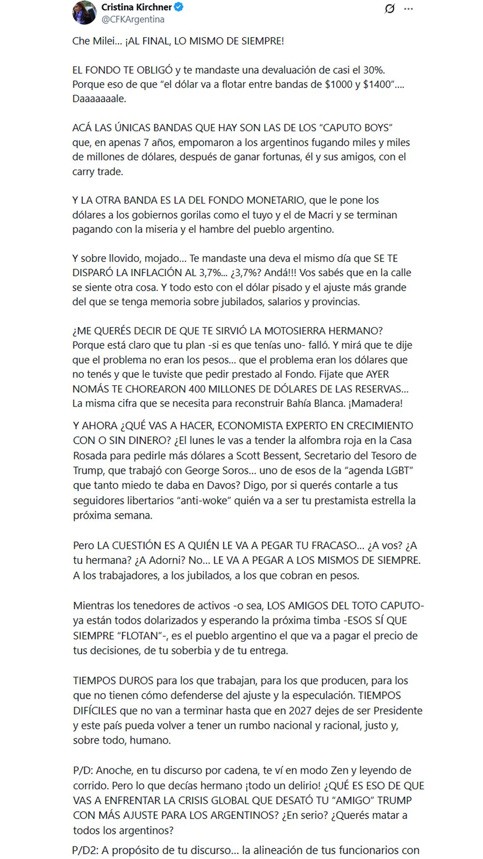 En una de sus dos posdatas -que ya son habituales en sus mensajes en X-, Cristina dijo que durante la cadena nacional del viernes por la noche vio a Milei “en modo zen y leyendo de corrido”. Y replicó: “Pero lo que decías hermano ¡todo un delirio! ¿Qué es eso de que vas a enfrentar la crisis global que desató tu ‘amigo’ Trump con más ajuste para los argentinos? ¿En serio? ¿Querés matar a todos los argentinos?“.