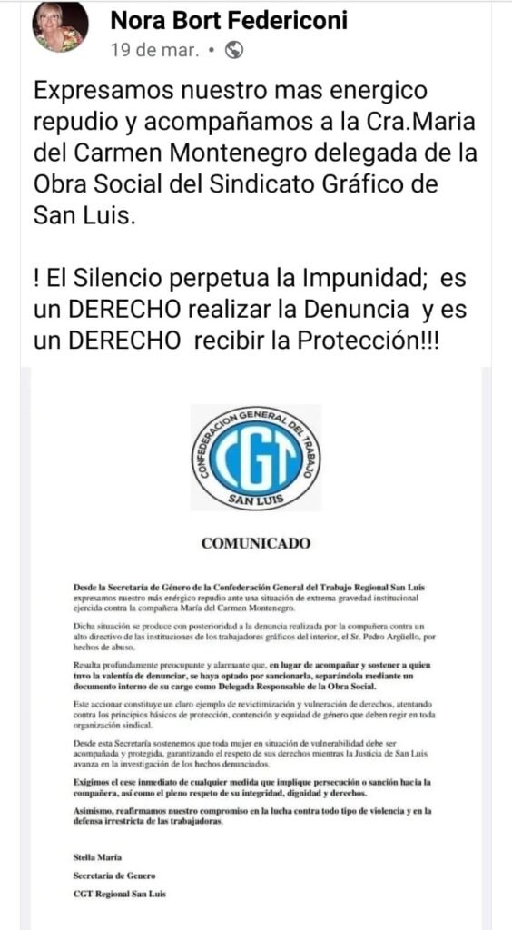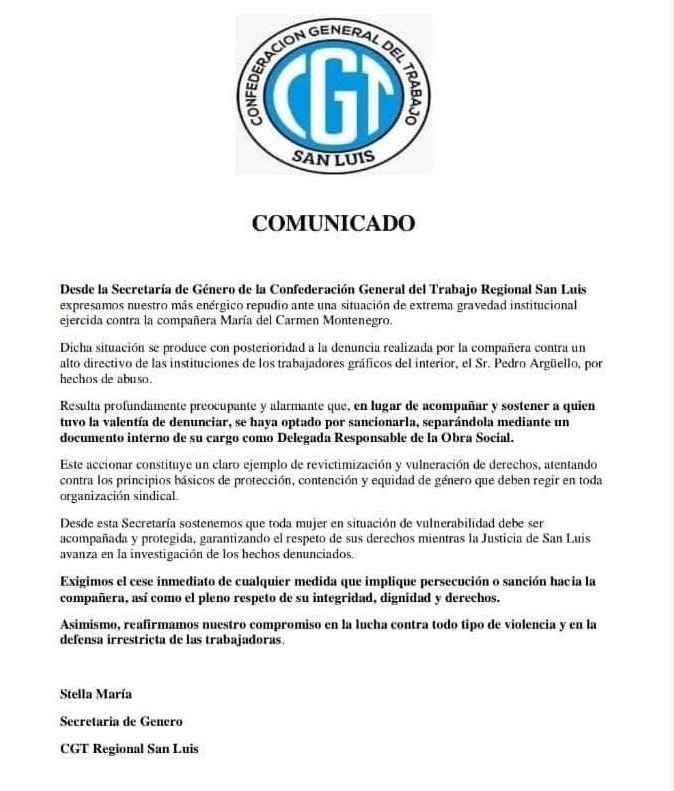 La denuncia realizó la tesorera del Sindicato Gráfico de San Luis contra el Secretario General del Sindicato Gráfico de Chaco, Pedro Arguello quien, a su vez, es dirigente de la Federación Gráfica Nacional de Imprenta (FATIDA).