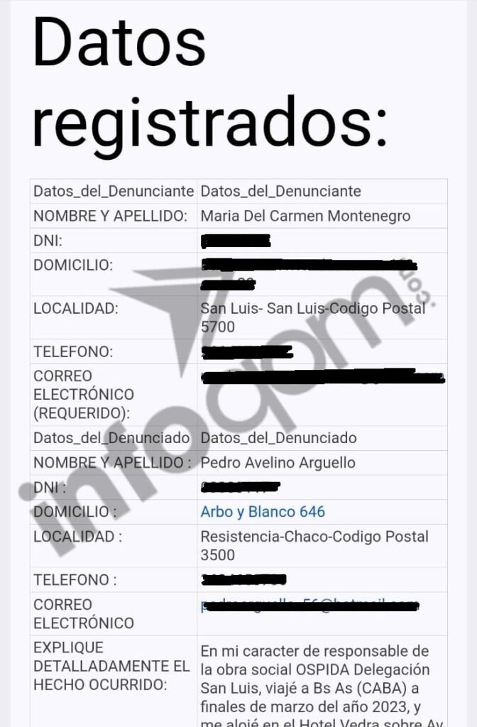 «El denunciado debía mantener charlas conmigo debido a temas de FATIDA y OSPIDA, ya que es autoridad en ambas instituciones», relató Montegro, explicando que «Como se trata de un adulto mayor, accedí a su llamado telefónico para ir hasta su habitación a concluir un tema pendiente de índole institucional».