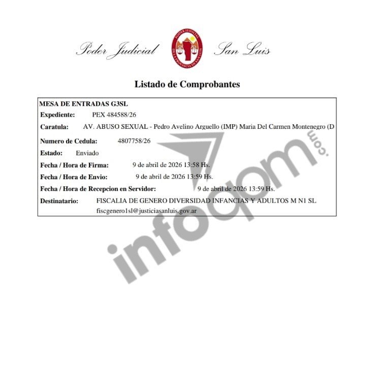 Montenegro agregó que al ingresar, Arguello puso llave a la puerta y ella le indicó que no era necesario, luego se produjeron los manoseos y forcejeos, según el relato que consta en la denuncia realizada el 9 de abril de 2026 ante la Fiscalía de Género, Diversidad, Infancias y Adultos, del Poder Judicial de San Luis, bajo Expte PEX 484 588/26.