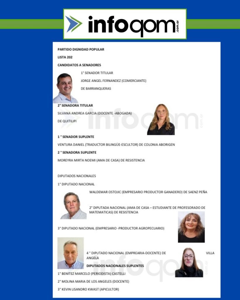 Los principales referentes de la lista son, quien encabeza la nómina de Senadores, Jorge Ángel Fernández, Comerciante, oriundo de Barranqueras, y Silvana Andrea García, Docente y Abogada , oriunda de Quitilipi, que lo acompaña como segunda Senadora titular. “Venimos del trabajo, de la docencia, de la vida real, no de los privilegios de la política. Queremos llevar la voz de la gente común al Congreso”, destacaron.