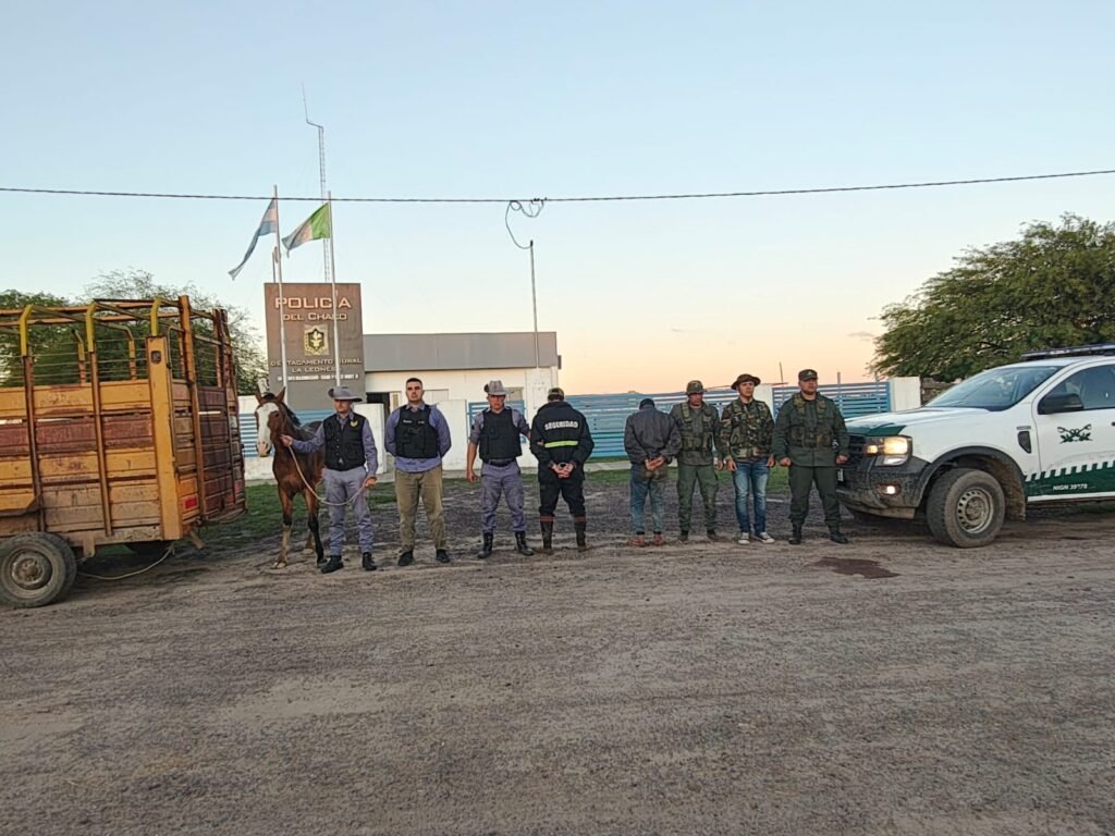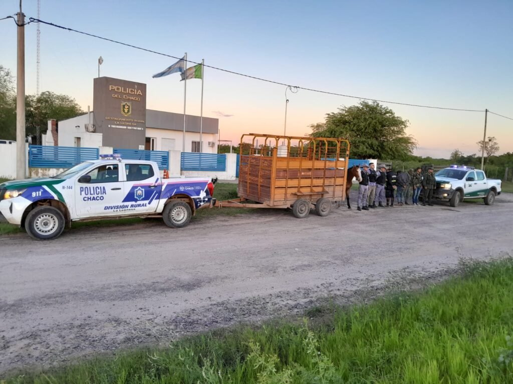 El procedimiento comenzó cerca del mediodía, cuando un productor del paraje El 35 denunció el corte del alambrado perimetral de su campo y rastros de animales equinos que cruzaban hacia otra zona. Ante el aviso, personal de la División Rural La Leonesa inició un operativo de rastrillaje y seguimiento de huellas que se extendió hasta el paraje San Fernando, con apoyo de Gendarmería Nacional.