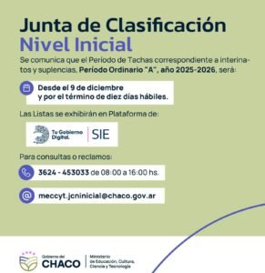 El Ministerio de Educación, a través de la Junta de Clasificación de Nivel Inicial, comunica que a partir del día 9 de diciembre, y por el término de diez días hábiles, se llevará a cabo el período de tachas correspondiente a interinatos y suplencias, Período Ordinario «A», Año 2025-2026.
