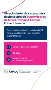 El Ministerio de Educación del Chaco informa que hoy, lunes 13 de octubre, se realizarán los actos de ofrecimiento de cargos de supervisores para los niveles Inicial y Primario (común) en este último caso -primer llamado- a partir de las 9 Hs, en el Salón de Usos Múltiples de la Escuela de Educación Secundaria (EES) N° 67, ubicada en avenida San Martín y calle Franklin, de Resistencia.