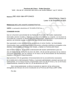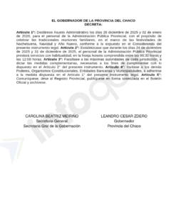 El Gobierno del Chaco oficializó el asueto administrativo para los días 26 de diciembre de 2025 y 2 de enero de 2026, una medida que alcanzará a todo el personal de la Administración Pública Provincial y que permitirá la conformación de dos fines de semana largos consecutivos en el cierre y comienzo de año.