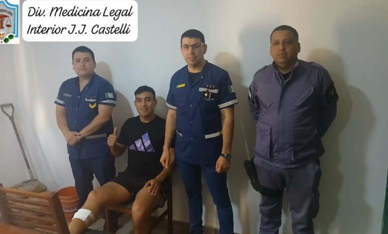 Según informó la División de Medicina Legal, el personal policial fue trasladado a su domicilio para monitorear su estado de salud y realizar la curación de la herida sufrida. Se trata de una lesión de aproximadamente 3 centímetros en la cara anterior de la pierna derecha, que fue suturada con tres puntos.