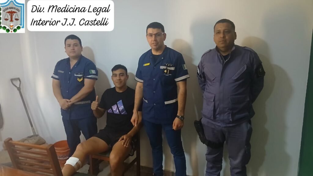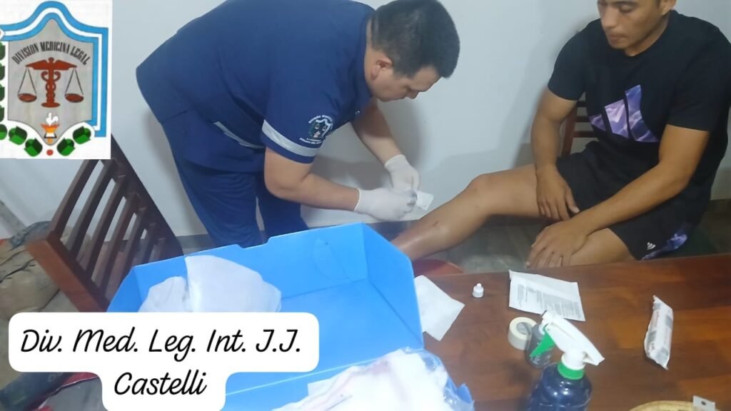Según informó la División de Medicina Legal, el personal policial fue trasladado a su domicilio para monitorear su estado de salud y realizar la curación de la herida sufrida. Se trata de una lesión de aproximadamente 3 centímetros en la cara anterior de la pierna derecha, que fue suturada con tres puntos.
