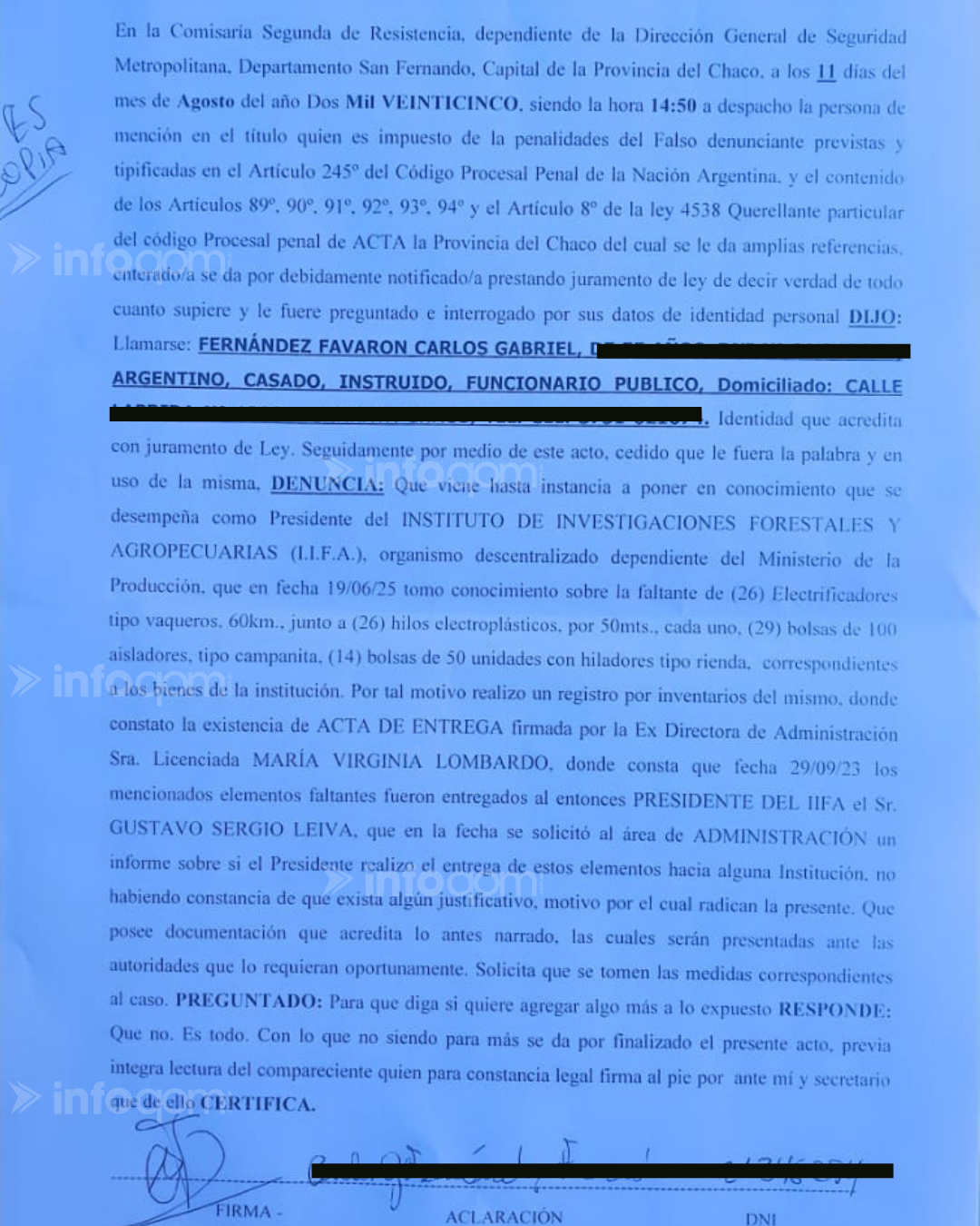 Este lunes el actual presidente del Instituto de Investigaciones Forestales y Agropecuarias, Carlos Favarón realizo una denuncia contra el ex presidente de dicho organismo, Gustavo Sergio Leiva ya que ante el faltante de varios bienes comenzó a realizar un control y halló un acta que acredita que en fecha 29 09 23 la ex directora de administración María Virginia Lombardo habría realizado la entrega a Leiva de 26 electrificadores tipo vaqueros 60km, 26 hilos electro plásticos por 50mts, 29 bolsas de 100 aisladores tipo campanita y 14 bolsas de 50 unidades con hiladores tipo rienda.