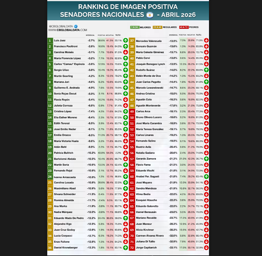 Los tres senadores nacionales con mejor diferencial de imagen en el mes de ABRIL 2026 son: en primer lugar, Luis Juez de Córdoba, quien alcanza un diferencial de -2,7%; en segundo lugar se ubica Francisco Paoltroni de Formosa, con -2,8%; y en tercer lugar aparece Carolina Moisés de Jujuy, con un diferencial de -3,1%.
