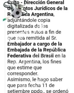 El procedimiento, llevado a cabo a través de un Oficio de Comunicación, tiene como objetivo notificar al Embajador a cargo de la Embajada de la República Federativa del Brasil en Argentina.