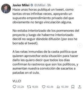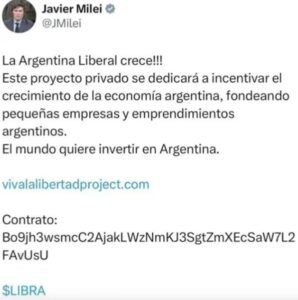 El 14 de febrero de 2025, Javier Milei publicó el twit que incentiva la compra de una criptomoneda, fijó el mensaje en su perfil durante seis horas y después lo borró El 14 de febrero de 2025, Javier Milei publicó el twit que incentiva la compra de una criptomoneda, fijó el mensaje en su perfil durante seis horas y después lo borró
