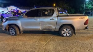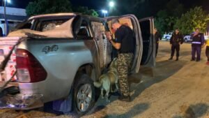 En ese sector, la camioneta fue interceptada momentáneamente, pero el conductor efectuó disparos contra el personal policial con el objetivo de continuar la huida. Afortunadamente, ningún efectivo resultó herido. Minutos después, el rodado sufrió la rotura de un neumático, lo que provocó que el conductor perdiera el control y terminara en una zona de malezas. Aprovechando esa situación, abandonó el vehículo y se internó en el monte, logrando escapar.