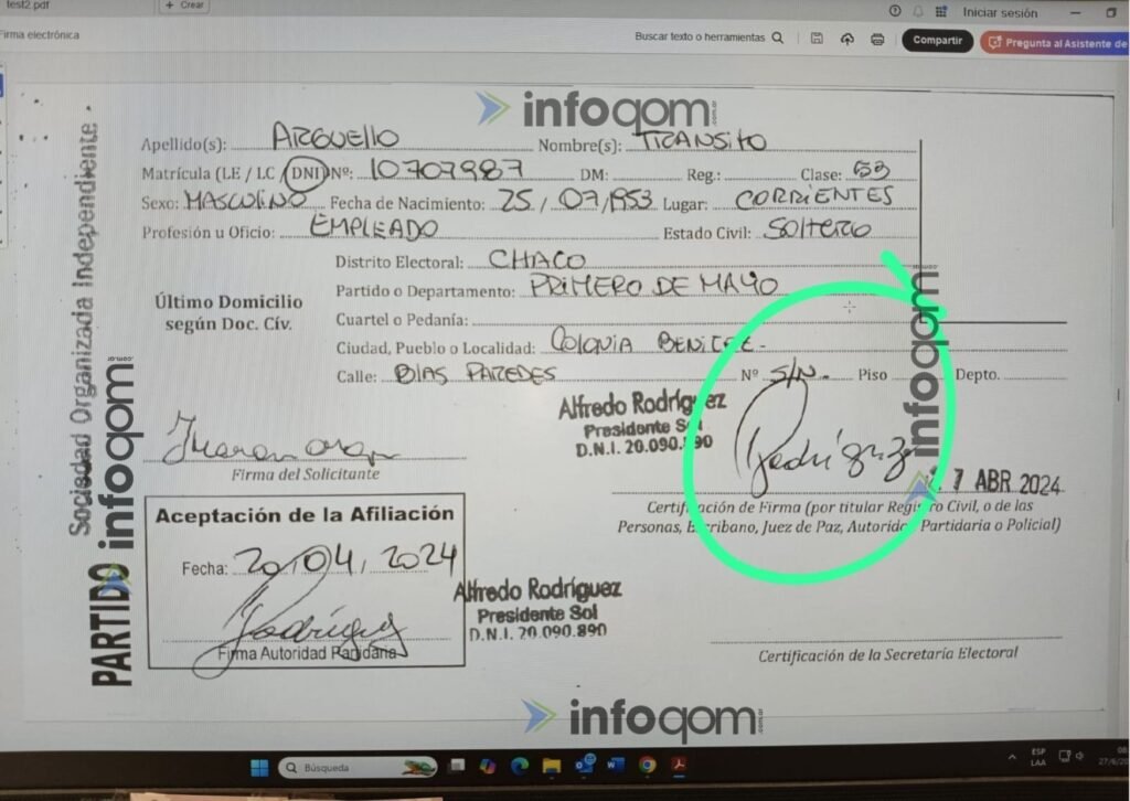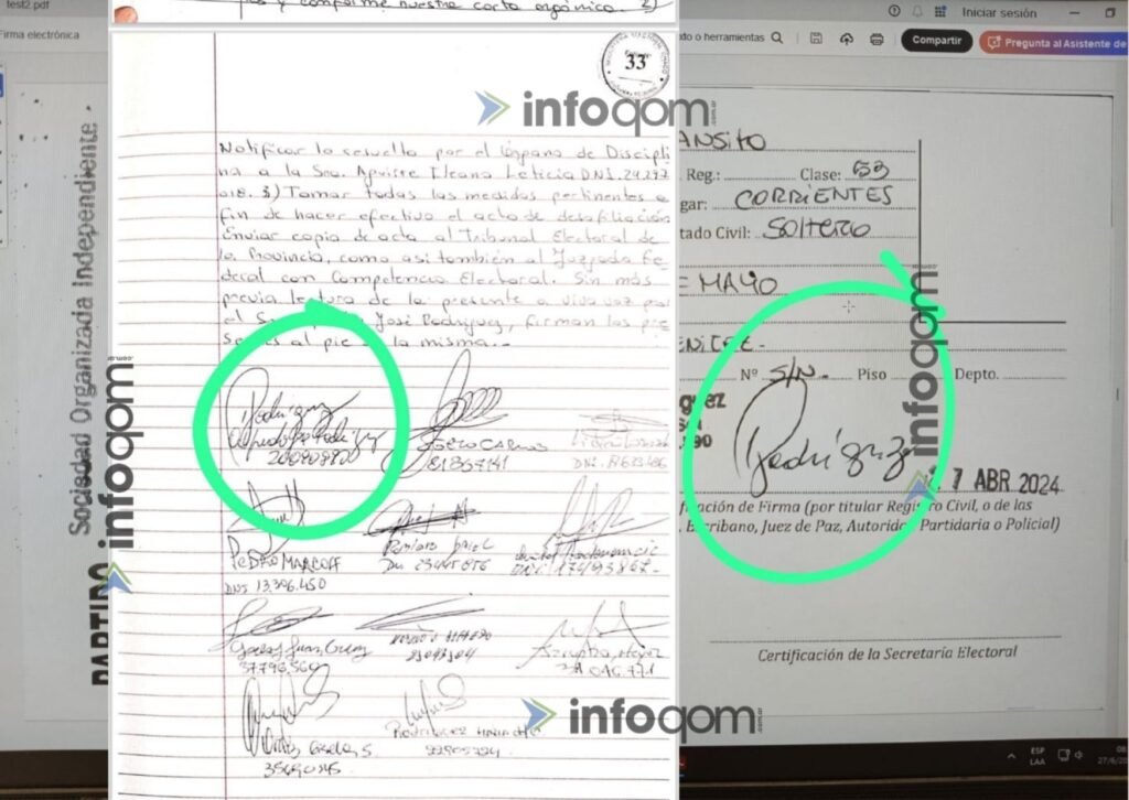 Infoqom accedió a dos documentos clave: el acta de expulsión firmada por Rodríguez y una de las fichas de afiliación cuestionadas. En ambas, aparece la misma rúbrica del dirigente. “Si no es su firma, el falsificador es muy bueno”, ironizó una fuente vinculada a la causa.