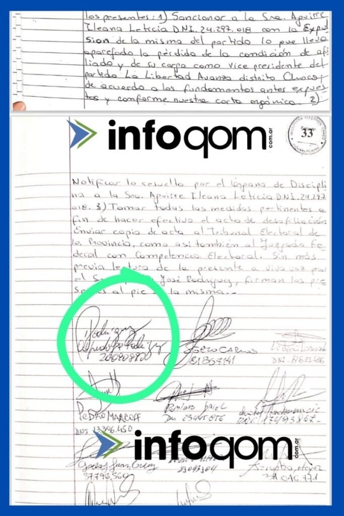 El acta de expulsión de Iliana Aguirre del partido LLA Chaco que lleva la firma de Capi Rodriguez.
