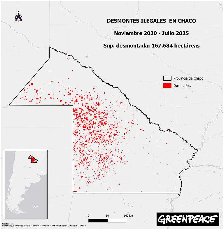 Según datos oficiales y del relevamiento satelital de Greenpeace, entre noviembre de 2020 y julio de 2025 en Chaco se deforestaron ilegalmente 167.684 hectáreas.