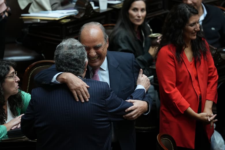 Interpelación por el caso $LIBRA en Diputados: Guillermo Francos abraza al diputado kirchnerista Eduardo Valdés. Santiago Oroz – LA NACION