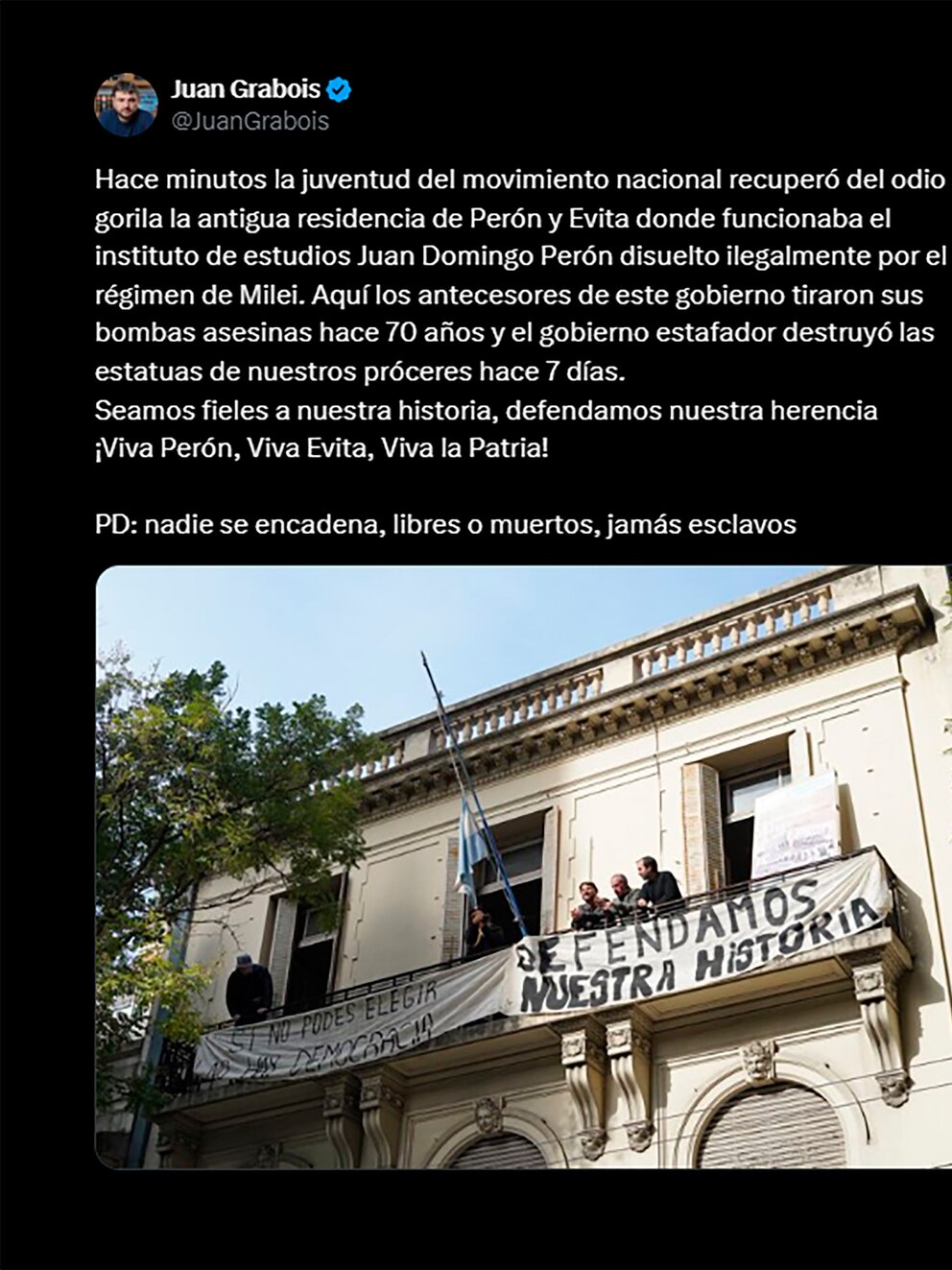 Horas antes, Grabois encabezó la ocupación del sitio histórico. “Hace minutos la juventud del movimiento nacional recuperó del odio gorila la antigua residencia de Perón y Evita donde funcionaba el instituto de estudios Juan Domingo Perón disuelto ilegalmente por el régimen de Milei”, anunció desde sus redes sociales. “Aquí los antecesores de este gobierno tiraron sus bombas asesinas hace 70 años y el gobierno estafador destruyó las estatuas de nuestros próceres hace 7 días”, agregó.