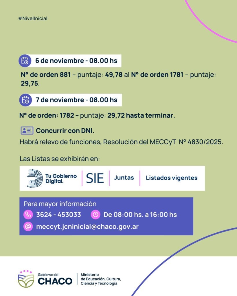 La Junta de Clasificación de Nivel Inicial, comunica a los docentes de Nivel Inicial de toda la provincia, sobre las fechas de los actos de adjudicación de cargos de maestros/as de sección de Jardines Maternales y/o de Infantes del Concurso de Traslado y Reincorporaciones Nº 53 y Concurso de Ingreso a la Docencia Nº 52, que se realizarán en el Salón de Convenciones del Bicentenario, sito en Av. Los Inmigrantes 300, de Resistencia.