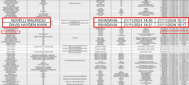 Aquella reunión no fue la única vez que Mark Davis estuvo en la Casa Rosada. De hecho, dos ingresos de Novelli coinciden con los de Hayden Mark Davis. Ambos entraron el 16 de julio, autorizados por Karina Milei, entre las 15:07 y las 15:45. El segundo, el 21 de noviembre, entre las 14:30 y las 15:17. Ninguno de ellos fue informado en el Registro de Audiencias.