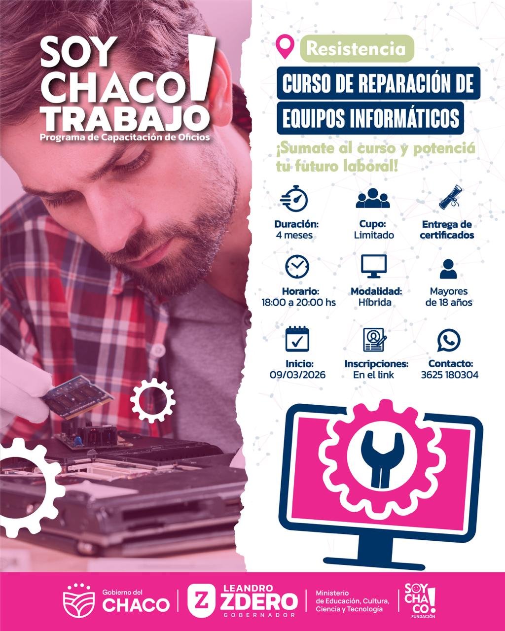 Este martes, la Fundación Soy Chaco anunció la apertura de nuevos cursos de formación en la ciudad de Resistencia. El primero, sobre Fabricación de Muebles en Metal y Madera y el segundo: Reparación de Equipos Informáticos, en el marco del programa Soy Chaco Trabajo.