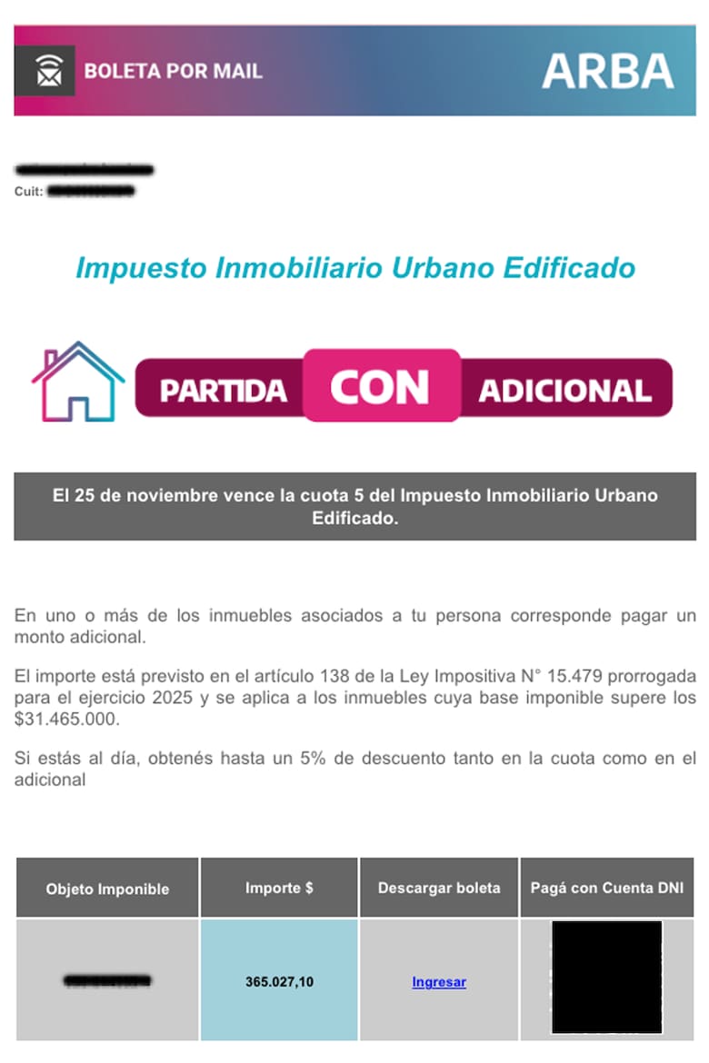 El monto adicional tiene topes diferenciados según el tipo de inmueble: en el Impuesto Inmobiliario Urbano Edificado, el adicional no puede superar el 20% del impuesto anual determinado para el período. Para el Impuesto Inmobiliario Rural (componentes básico y complementario), el incremento máximo es del 25% sobre el impuesto liquidado. “Estos límites aseguran previsibilidad para los contribuyentes y acotan el alcance del adicional a los segmentos de mayor valuación”, dijeron desde ARBA. Estos topes implican que las cuotas adicionales son igual a la última cuota recibida; por eso el monto a pagar se duplica.