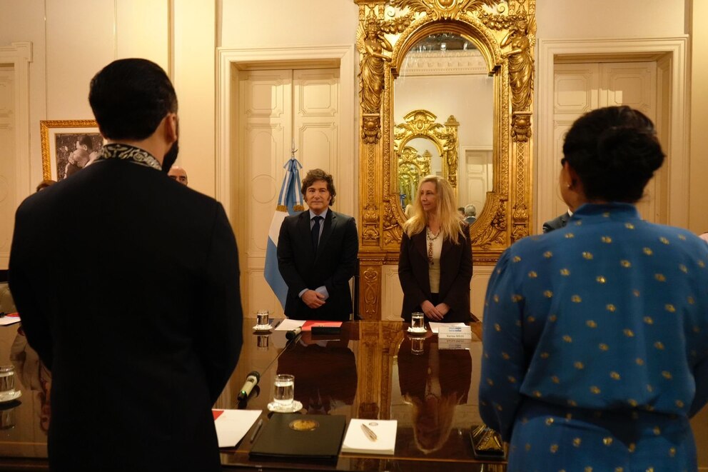 El mandatario extranjero fue recibido con alfombra roja por Milei, mientras lo escoltaba por la banda militar del Regimiento de Granaderos quienes le hicieron un pasillo de honor y luego le presentó a los ministros.