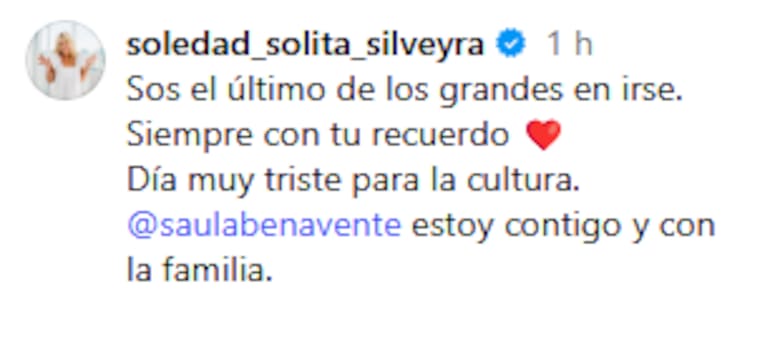 Por su parte, su compañera Solita Silveyra publicó un mensaje en su cuenta de Instagram junto con una imagen en donde lo definió como “el último de los grandes en irse”. “Siempre con tu recuerdo”, expresó la actriz y agregó: “Día muy triste para la cultura”. Además, le mandó fuerzas a la novia de Brandoni, Saula Benavente: “Estoy contigo y con la familia”.