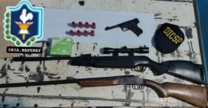 El procedimiento se realizó entre las 15:45 y las 18:00, y en el lugar se encontraba el propietario del predio, un hombre de 50 años, quien fue aprehendido por disposición de la magistratura. Durante la requisa, los efectivos hallaron y secuestraron un teléfono celular, un rifle calibre 22 con mira telescópica, una escopeta calibre 12, ocho cartuchos y una pistola calibre 22 sin número visible.