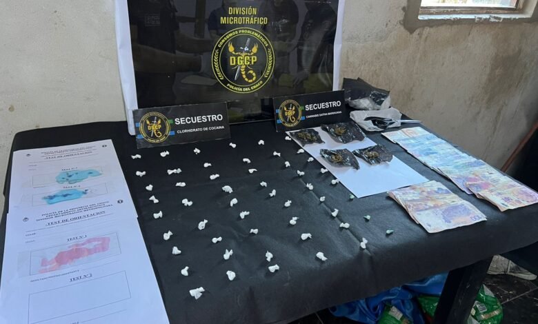 El procedimiento, que se inició alrededor de las 18:15, arrojó resultados positivos. Durante la inspección, los agentes hallaron 50 envoltorios y tres piedras de cocaína con un peso total de 12,7 gramos, además de cuatro envoltorios de marihuana que pesaron 4,7 gramos. También secuestraron recortes de bolsas de nylon, una tijera y la suma de 5.500 pesos en efectivo, elementos vinculados a la actividad de fraccionamiento y venta de drogas.