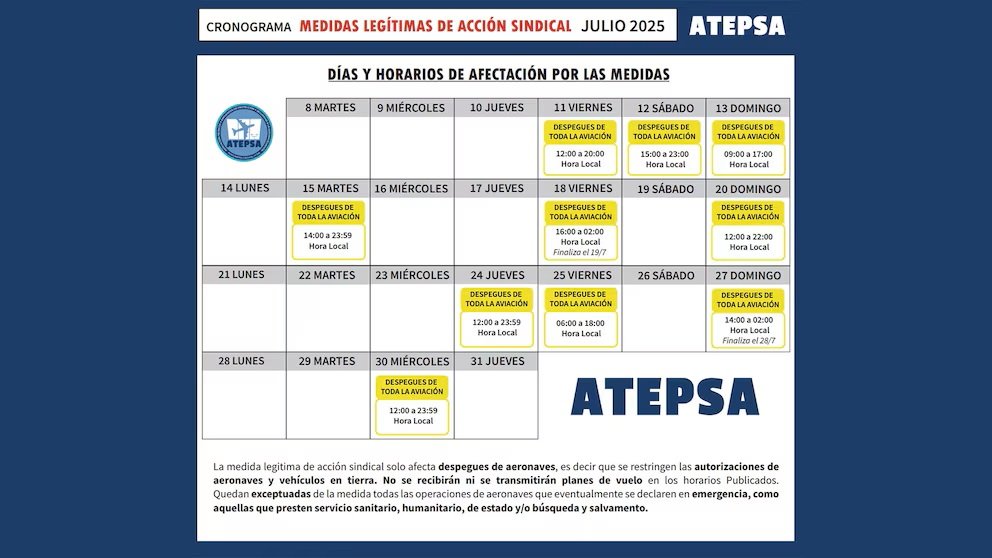 A través de un comunicado difundido en sus redes sociales, el gremio anunció que ratifica el plan de acción sindical y publicó un nuevo cronograma actualizado con fechas y horarios precisos de afectación para el mes de julio. Las medidas están organizadas en franjas horarias específicas y alternadas, con distintos niveles de impacto sobre vuelos nacionales, internacionales y generales. La protesta sindical apunta directamente a la operación de despegues en todos los aeropuertos del país, coincidiendo con el período de vacaciones de invierno, cuando se intensifica el tráfico aéreo por turismo interno y receptivo.