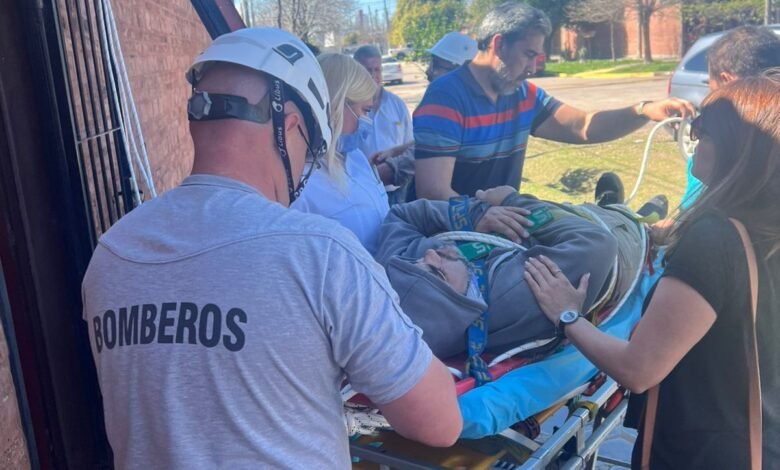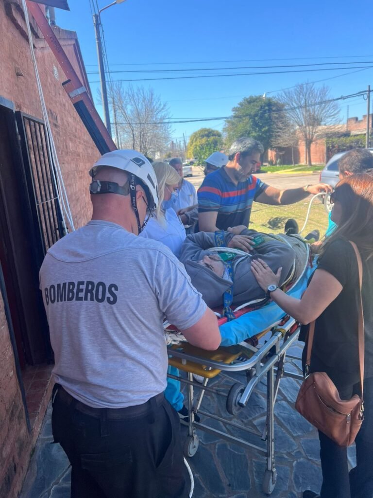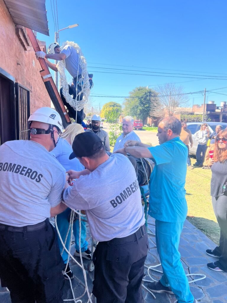Desde el domicilio, llamaron al Servicio de Emergencias 911, y la Sala de Despacho dio aviso a la Sección Rescate y Salvamento, que acudió de inmediato al lugar. Los Bomberos utilizaron una escalera de aluminio de dos tramos, inmovilizaron al trabajador con collarín y tabla rígida, y descendieron utilizando técnicas de rescate con cuerdas y sistemas de deslizamiento para garantizar su seguridad.