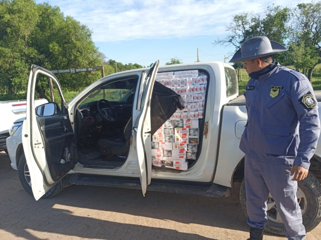 El operativo conjunto entre la Policía Rural y Gendarmería Nacional terminó con el secuestro de una camioneta Toyota Hilux cargada con más de 40 cajas de cigarrillos extranjeros. Los ocupantes del vehículo lograron escapar.