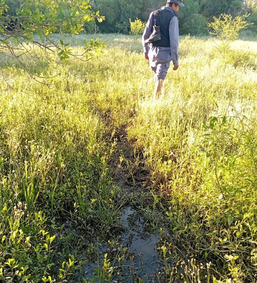 El procedimiento se realizó en la Estancia Don Panos, luego de que los efectivos recibieran la denuncia por la sustracción de seis ruedas pertenecientes a equipos de riego del establecimiento. Inmediatamente, los agentes iniciaron un seguimiento de huellas por caminos rurales y zonas de monte, que se extendió por más de diez kilómetros.