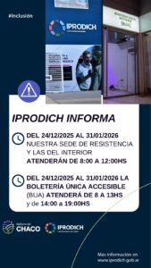 El Instituto Provincial para la Inclusión de las Personas con Discapacidad del Chaco (IPRODICH) informa a la comunidad que, con motivo del receso administrativo, se establecieron horarios especiales de atención al público entre el 24 de diciembre de 2025 y el 31 de enero de 2026.