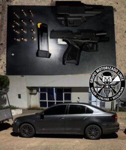 Durante la inspección del interior del vehículo, los efectivos hallaron una pistola marca Taurus GX4, calibre 9 milímetros, de color negro, con un cargador que contenía 12 cartuchos del mismo calibre, además de su correspondiente funda. Al ser identificado, el conductor no pudo acreditar la documentación que habilitara la tenencia ni la portación legal del arma.