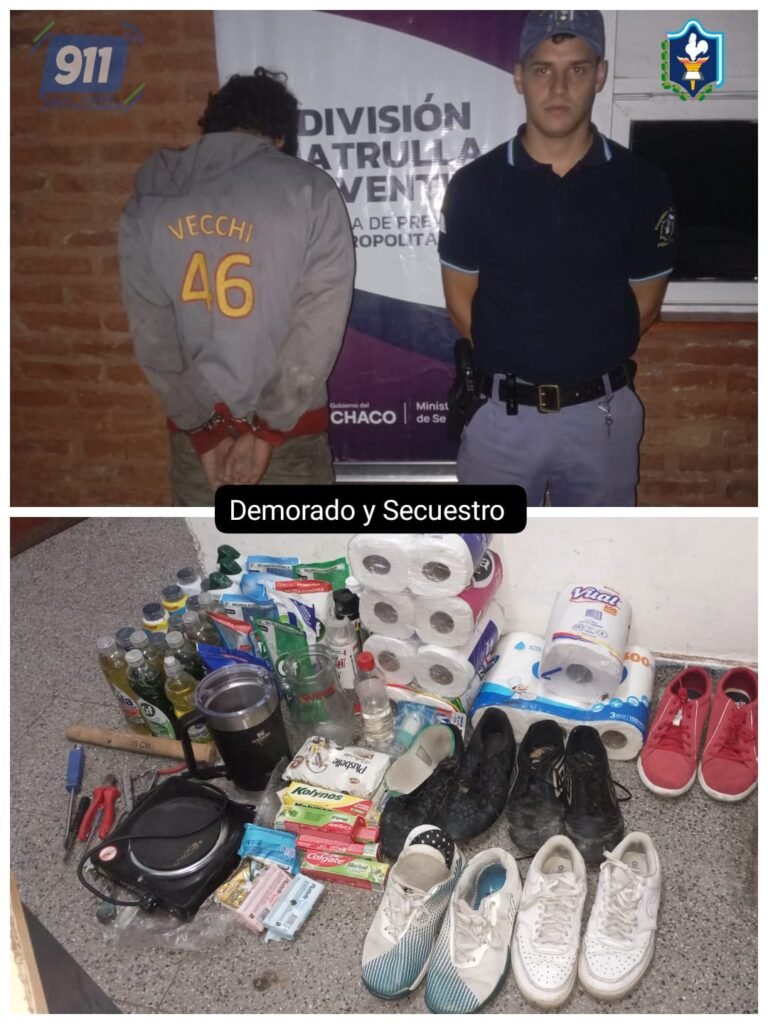 El primer procedimiento tuvo lugar cerca de las 2:30, en calle Seitor al 1045, donde los agentes observaron a un joven que llevaba un bulto verde a la rastra. Al notar la presencia policial, el individuo intentó escapar, pero fue rápidamente demorado. Se trataba de un hombre de 25 años, quien transportaba elementos de limpieza, una jarra, un anafe, varios pares de zapatillas, herramientas y otros objetos, sin poder justificar su procedencia. Todos los bienes fueron secuestrados, y el sujeto trasladado a la Comisaría Séptima para las actuaciones de rigor.