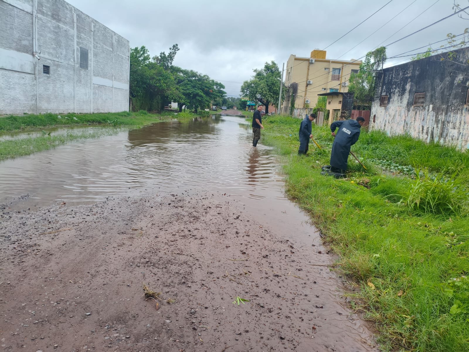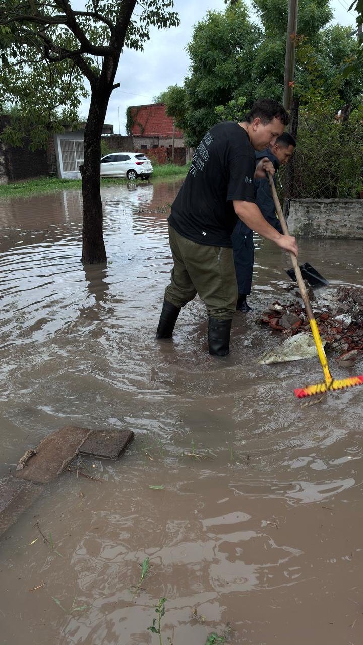 El personal policial se volcó a las calles para colaborar directamente con los vecinos en la limpieza de cunetas y tareas de descacharrado, fundamentales para liberar los desagües anegados por el temporal.