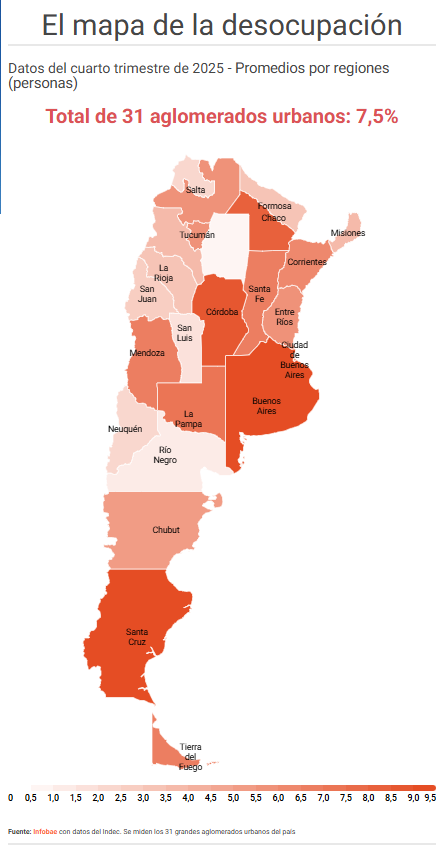 La quinta región más afectada es la Patagonia, que tuvo una desocupación del 4,8% a finales de 2025. Sin embargo, en su interior se encuentra uno de los aglomerados con peor resultado del país. Se trata de Río Gallegos, que alcanzó un nivel de desempleo del 9,5%. En el otro extremo, llama la atención el aglomerado de Viedma-Carmen de Patagones, que tuvo una tasa de 1,3 por ciento.