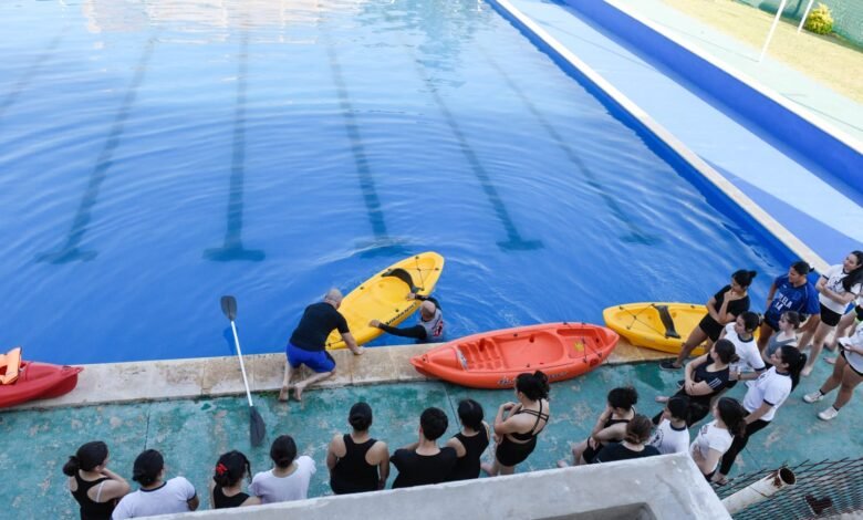 Con la participación de alumnas de la UEGP N° 54, comenzó la práctica de canotaje en la pileta del polideportivo municipal.