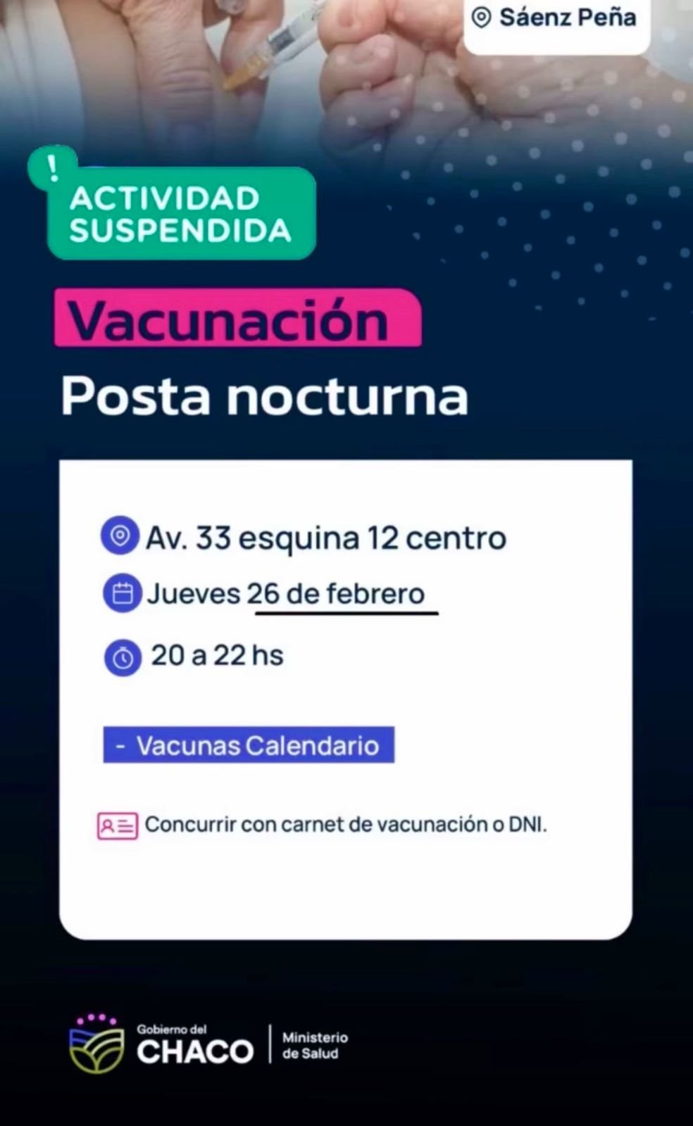 El Ministerio de Salud comunica a la comunidad que la posta nocturna de vacunación prevista para hoy, en la intersección de la avenida 33 y calle 12 del centro, fue suspendida y será reprogramada en una nueva fecha que será informada oportunamente.