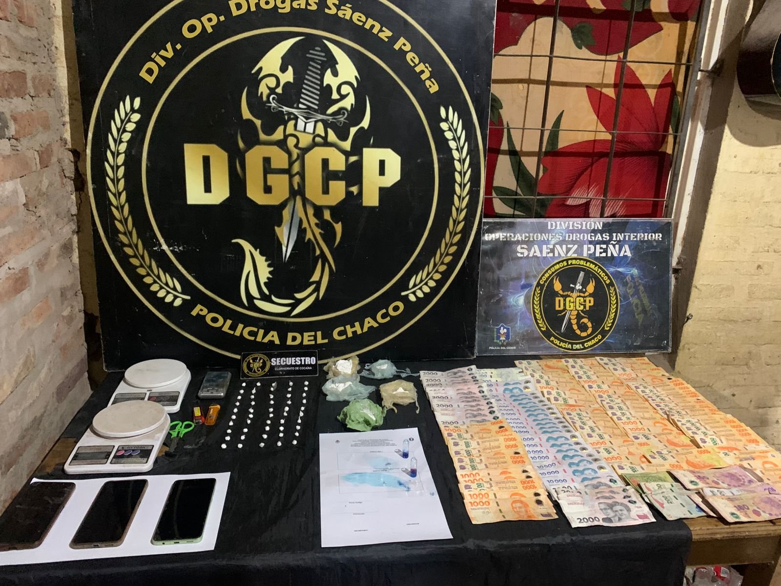 Durante el operativo se incautaron 50 envoltorios con cocaína (9,8 gramos), cuatro envoltorios con trozos compactos (110,7 gramos) y otro envoltorio con sustancia disgregada (9,2 gramos), totalizando 129,7 gramos. Además, se secuestraron tres balanzas —una de precisión y dos de mayor tamaño—, tres teléfonos celulares, una tijera, dos encendedores y $432.000 en efectivo.